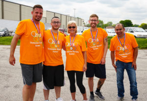 Twenty employees were split into teams of five with their matching colored Olympic Games t-shirt. This time around the event was sponsored by Morreale Meat, Professional Freezing, Lincoln Provisions, and Amigos Foods. Each sponsor gave a generous donation to the event’s cause and had their company logo on the participants t-shirts. Team members from various departments were represented in the games, including Finance, Logistics, Operations, FSQA, and Sales. Thanks to the cooperative Chicago weather, the games were hosted outside, and they were “Stampede” themed events such as getting suited for production and building a pallet of boxes for distribution! Orange Team winner Sophie Bozek exclaimed, “Oh my goodness! I cannot believe how much fun I had with these crazy team members. Everyone had such an amazing energy and competitive spirit. I already can’t wait for the next Olympic Games!” Two-time winner from last year’s Yellow Team and this year’s Orange Team Ward Hassan said,””